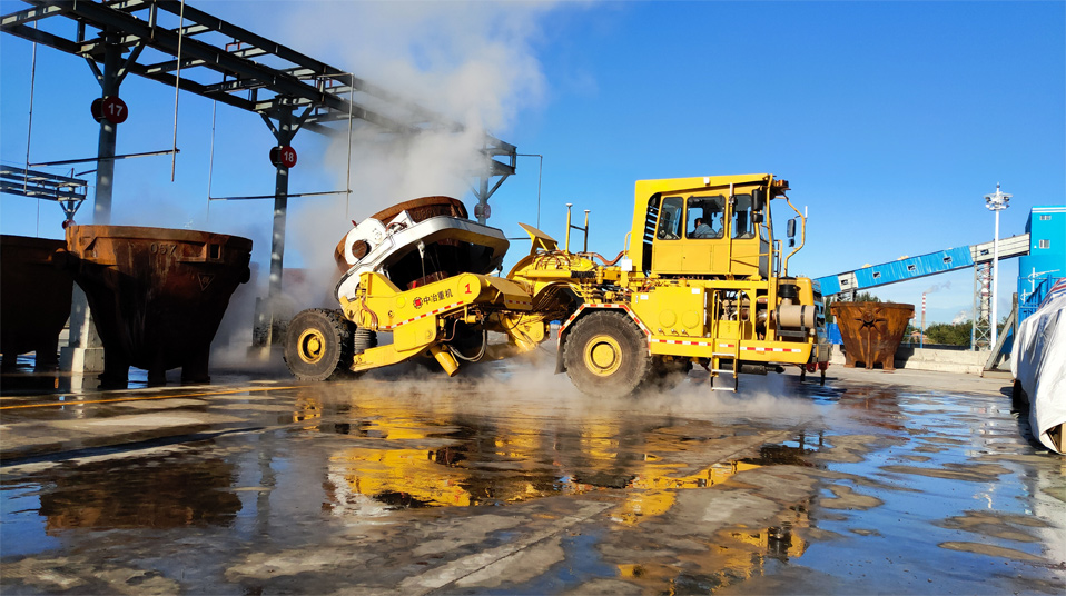 由中冶寶鋼研制的70噸鉸接式抱罐車,采用鵝頸鉸接型式,額定載重75噸,重載最高時速為每小時20公里,翻罐角度105度,最大爬坡能力8%,最小轉(zhuǎn)彎半徑9米。該車型應(yīng)用專利技術(shù)10項,在國內(nèi)有色冶煉市場占有率超過75%,先后榮獲中國有色工業(yè)協(xié)會、中國鋼鐵工業(yè)協(xié)會科技獎,中國施工企業(yè)管理和中國循環(huán)經(jīng)濟(jì)協(xié)會專利獎等榮譽(yù)。